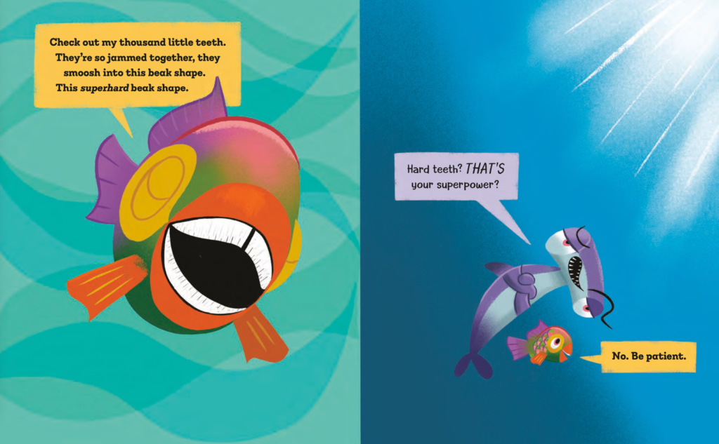 Just wait till you hear what a parrotfish can do! You may know they live in warm tropical waters, have an interesting trick for hiding from predators, and have crazy-incredible teeth. But they also do something that noother fish can do—and Parrotfish is eager to tell you all about it. There’s just one problem—nosy Hammerhead Shark keeps interrupting to talk about himself.